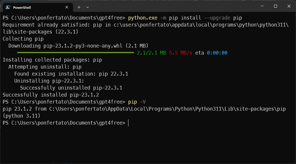 Если обновление прошло успешно, вы увидите сообщение о том, что Pip был успешно обновлен до последней версии.