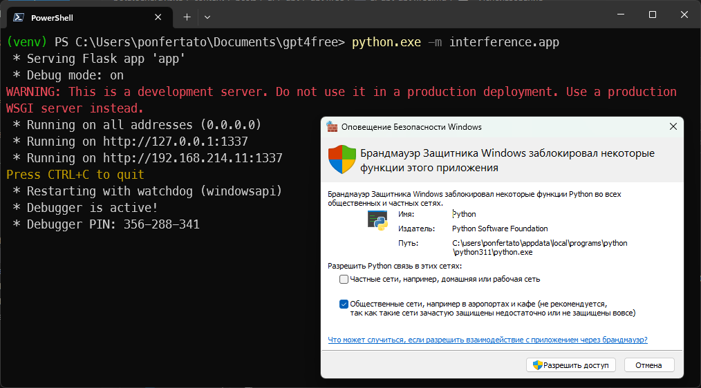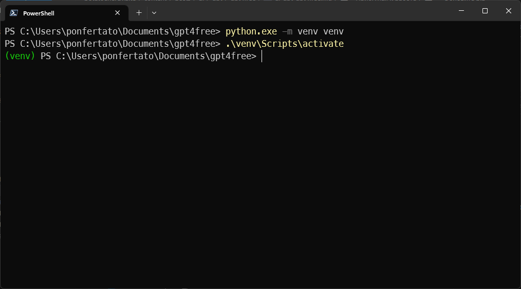 В дальнейшем для запуска GPT4Free включайте VPN, открывайте терминал и выполняйте последовательно три команды, приведённые ниже: